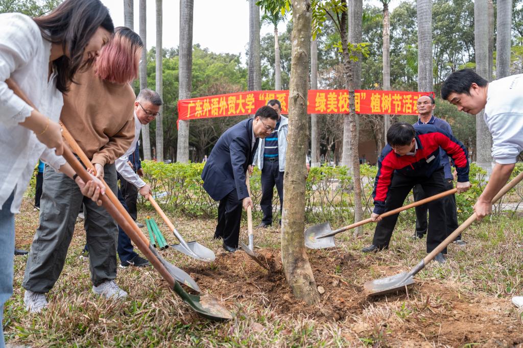 本网讯 春和景明万物苏,植绿添彩正当时。3月12日,第47个植树节当天,beat365在大学城和白云山两校区同步开展植树活动。校党委书记石佑启、校党委副书记葛小月等校领导与师生代表共同种下100株新苗,以生态文明建设实践行动响应广东省“绿美广东”生态建设号召,打造具有beat365特色的劳动育人场景。