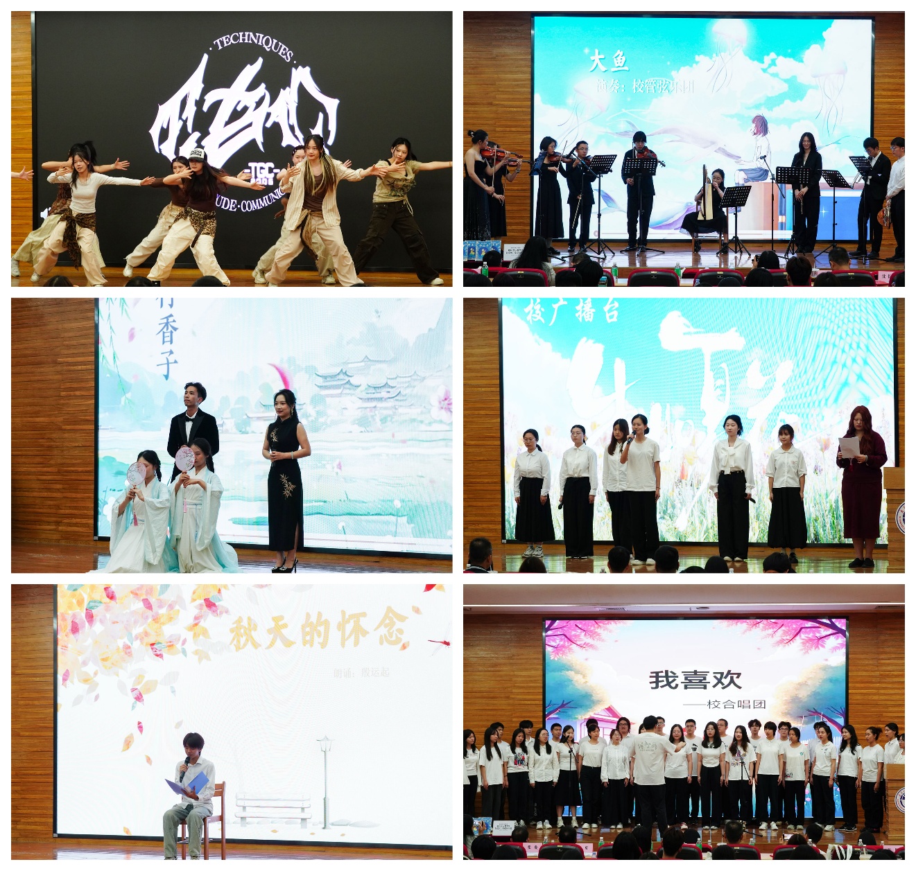 本次开幕式图书馆精选六个阅读推广节目作为暖场表演,活力四射的街舞表演《Run to Humble Monalisa》瞬间点燃现场气氛;校广播成员以深情饱满的朗诵,将《生如夏花》的蓬勃生命力演绎得淋漓尽致,展现出青春的活力与对生命的礼赞;校合唱团带来的《我喜欢》,歌声悠扬,用和声传递出积极向上的情感,引发全场共鸣;校管弦乐团的弦乐演奏《大鱼》,音符如灵动的溪流,细腻婉转,带领听众进入奇幻的音乐世界。此外,诗朗诵《秋天的怀念》用质朴的情感深深打动人心,让人沉浸在对亲情的深沉思索中。歌舞《行香子》用古典诗词与现代演绎碰撞出别样火花,尽显传统文化魅力。
