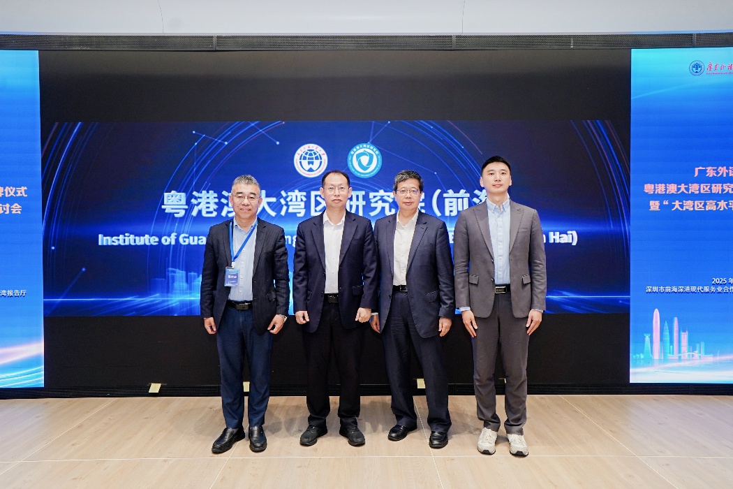 申明浩与多位嘉宾共同为研究院揭牌。揭牌仪式由粤港澳大湾区研究院副院长徐丽鹤主持。粤港澳大湾区研究院副院长杨永聪和专职研究员刘雅莹分别介绍了研究院的发展历程、主要成果,以及研究院最新一期出版的《粤港澳大湾区协同发展报告》蓝皮书。