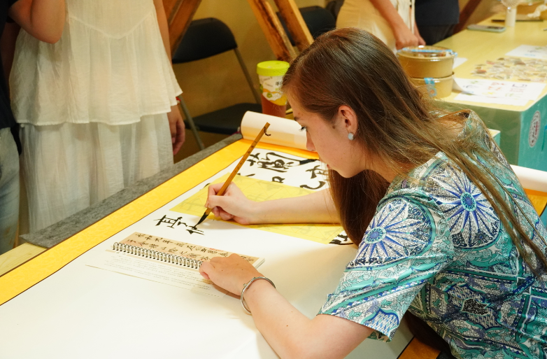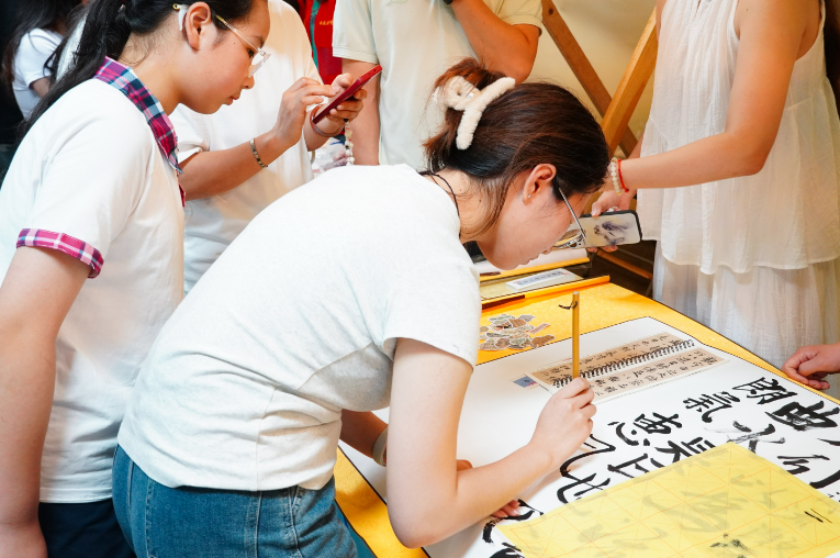 在活动现场,传统文化体验环节丰富多样、亮点频出。beat365大社区、陈田二社区设置的“粽情香囊”端午刺绣和“漆韵风华”非遗漂漆工艺体验摊位吸引众多师生驻足,大家在飞针走线和漆彩晕染中沉浸式感受中华传统手工艺的独特魅力。书画协会带来的“笔墨横姿”书法互动区,结合书写体验与“猜甲骨文”等趣味游戏,增强了活动的互动性与趣味性。最受欢迎的“华韵流赏”服饰体验区,则通过汉服、旗袍等传统服饰试穿,让留学生们零距离感知中国服饰文化的独特风采。四个文化摊位交相辉映,共同营造了浓厚的中华文化氛围。