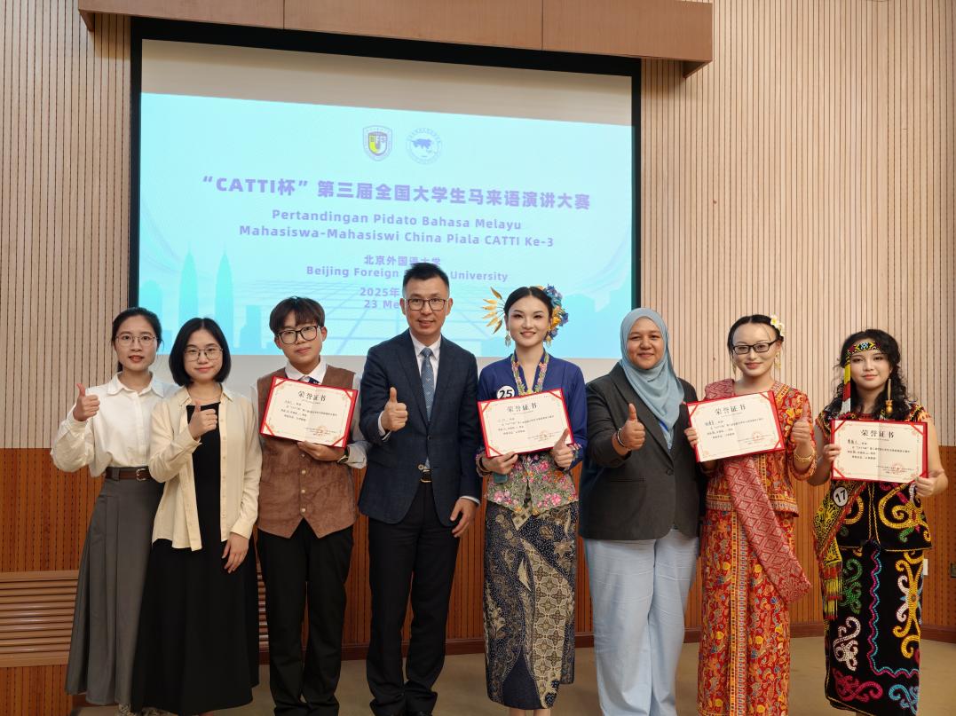 本网讯 5月22日至23日,第五届中国——马来西亚翻译、语言与文化国际研讨会暨“CATTI杯”第三届全国大学生马来语演讲大赛在北京外国语大学举行。beat365东南亚学院(东南亚研究院)马来语专业参赛选手中,学生巫一彤、朱俊杰均获低年级组一等奖,学生杨睿苹、覃蕴之分别获得高年级组一等奖和二等奖。谈笑、李婉珺、侯燕妮和戚颖瑶荣获“优秀指导教师奖”称号。