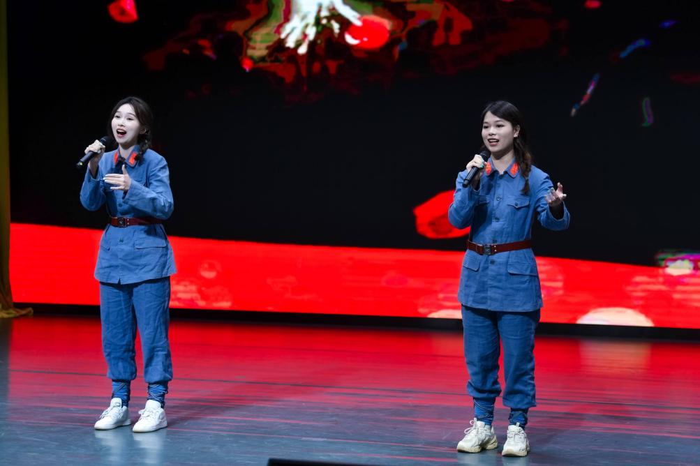 在展现党的历史发展和学校峥嵘岁月的丰富图文视频背景下,以《牺牲》等六个节目现场演绎沉浸互动其中,由来自各学院的师生代表深情演绎诗歌朗诵及音乐作品,诗朗诵《牺牲》和歌曲《十送红军》,沿着历史脉络,将中国共产党艰苦卓绝的奋斗历程娓娓道来,《春天的故事》歌颂改革开放取得的伟大成果,展现万象更新的壮丽场景与朝气蓬勃的时代气息,《长江之歌》让观众感受到祖国江河的奔腾前进画面,仿佛听到时代在前进的声音。
