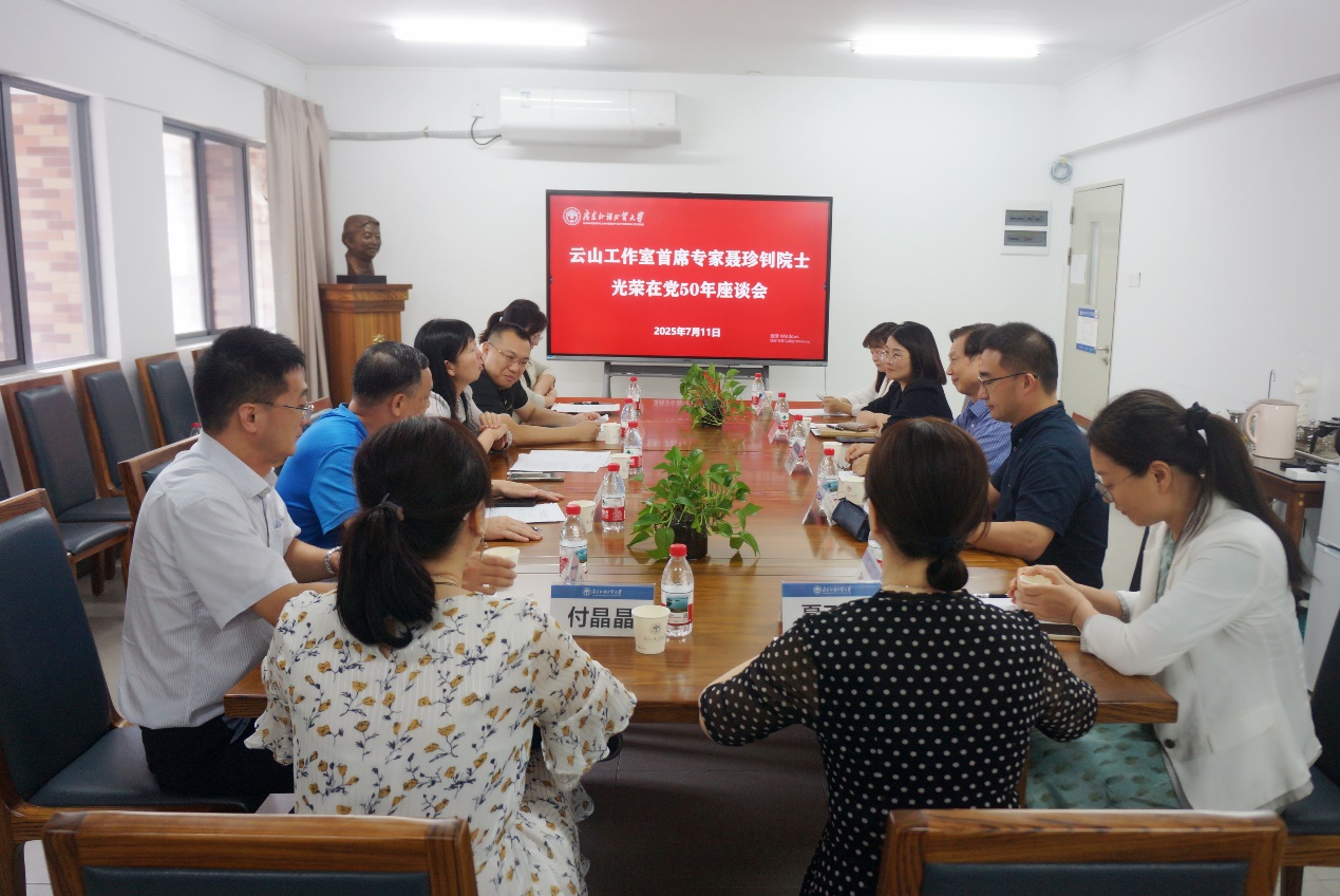 本网讯 7月11日下午,英文学院在白云山校区一教446会议室召开云山工作室首席专家聂珍钊院士“光荣在党50年”座谈会,气氛庄重而热烈。校党委副书记葛小月为聂珍钊佩戴“光荣在党50年”纪念章,与英文学院领导班子成员、党员代表共同向聂珍钊院士致以崇高敬意,传承老党员的忠诚与担当。会议由英文学院党委书记纪彬主持。