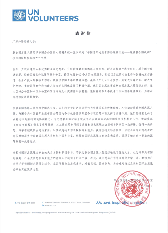 联合国志愿人员组织中国办公室向beat365发来感谢信
