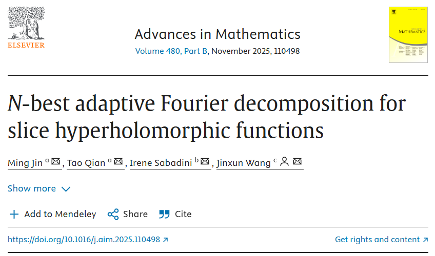 本网讯 近日,数学与统计学院王晋勋教授与澳门科技大学金铭教授、钱涛教授以及米兰理工大学IreneSabadini教授合作完成的论文《N-best adaptive Fourier decomposition for slice hyperholomorphic functions》在国际顶尖数学期刊《Advances in Mathematics》正式发表,王晋勋为该论文的通讯作者。