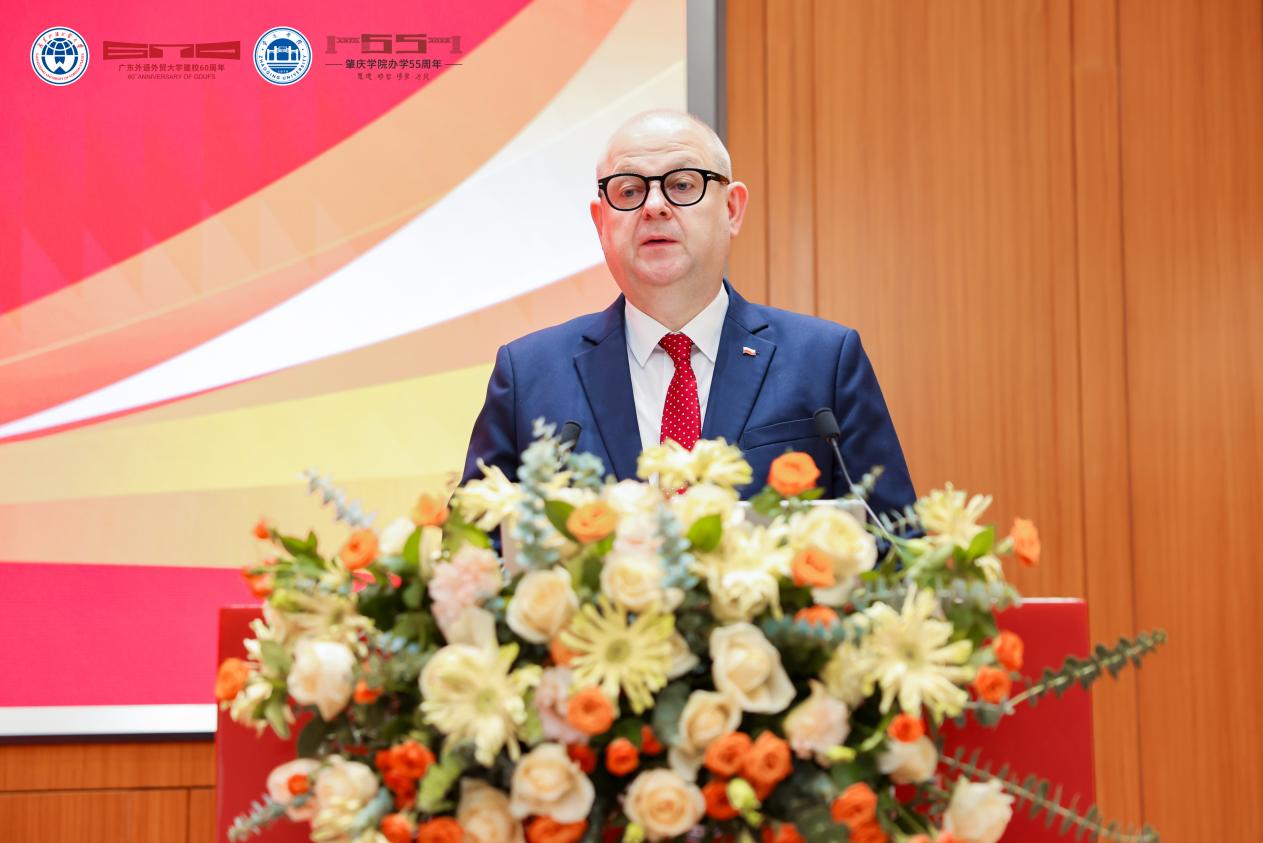 闫相斌在致辞中系统阐释区域国别学的学科意义,回顾了学校在学科建设、国际交流与人才培养方面的努力与成果;波兰共和国驻广州总领事彼得·诺沃特尼亚克先生高度评价中波合作,指出波兰作为中东欧重要国家,在历史、文化与教育领域与中国保持长期深入交流,并展望了中波及中国与中东欧国家学术合作的广阔未来;中共广东省委外事工作委员会办公室副主任李宏志结合地方外事实践,强调中东欧研究与国际合作要持续深化。