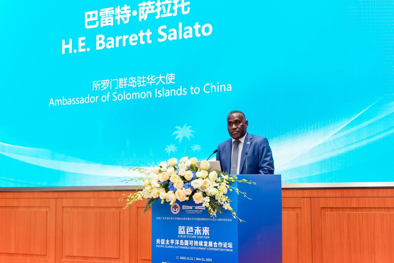 所罗门群岛驻华大使巴雷特·萨拉托先生以“从所罗门群岛的视角看气候变化”为题发表主旨演讲,深入阐述了气候变化对太平洋岛国带来的生存危机与对发展产生的深远影响,强调必须要进一步扩大国际支持,完善机构框架、强化监测系统,提升透明度和问责。最后呼吁加强中国—太平洋岛国合作,共同应对全球气候挑战。