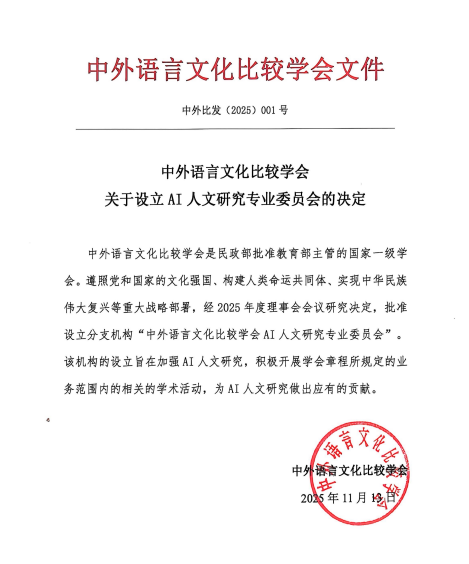 本网讯 近日,经中外语言文化比较学会2025年度理事会会议研究决定,中外语言文化比较学会AI人文研究专业委员会正式获批成立。