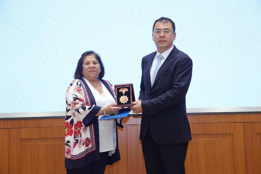 闫相斌为安赫莉卡·科尔佐颁发纪念奖章