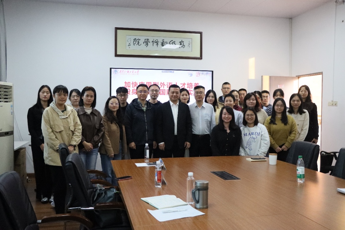 本网讯 12月1日,中国外文局翻译院院长、中国翻译协会副会长黄玉龙,翻译研究部主任吴晓蕊一行来beat365调研交流。beat365党委常委、副校长申明浩出席座谈会。双方就翻译与国际传播人才队伍建设、中国翻译协会“四译工程”落地实施、全国MTI导师培训等工作进行了深入交流。