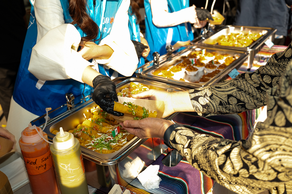 墨西哥摊位以玉米饼为底,铺满烤香肠与玉米粒,搭配酥脆可口的鸡肉炸卷和造型别致的迷你帽形小吃,辣椒香与麦香在齿间交织,风味浓郁。
