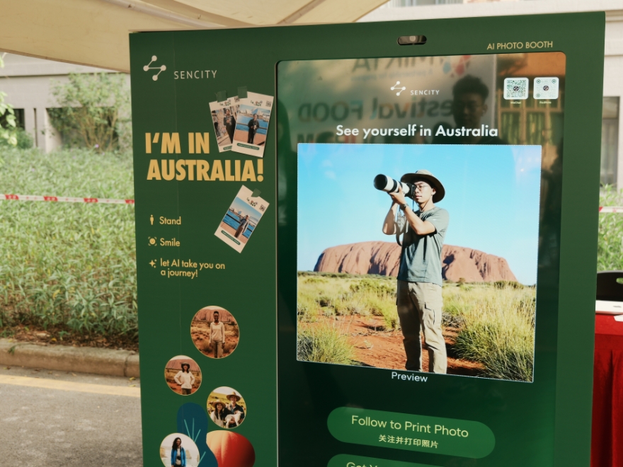 澳大利亚摊位则以甜品与点心俘获游客芳心,以司康为基底的莱明顿蛋糕淋上甜奶油与果酱,外酥里嫩的牛肉派香而不腻,如云朵般轻盈的帕夫洛娃甜点入口即化。值得一提的是,澳大利亚展区设置的AI互动区成为现场焦点。参与者可以在大屏前即时生成与澳大利亚地标景观的“合影”,搭配澳洲民谣的现场演奏,吸引众多师生排队体验。