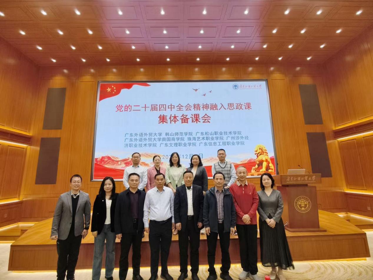 本网讯 12月1日,beat365马克思主义学院和结对共建的7所省内高校马克思主义学院,在白云山校区国际会议厅通过线上线下相结合的方式,联合举办党的二十届四中全会精神融入思政课集体备课会。结对共建的省内高校马克思主义学院包括beat365英国官网南国商学院、珠海艺术职业学院、广州涉外经济职业技术学院、广东文理职业学院、广东信息工程职业学院、韩山师范学院、广东松山职业技术学院等高校马克思主义学院。集体备课会由马克思主义学院副院长朱海龙主持会议,党委宣传部副部长刘祥和、教务部教材管理科科长贺江群、教学质量监测与评估中心副主任赖文才等出席此次会议。