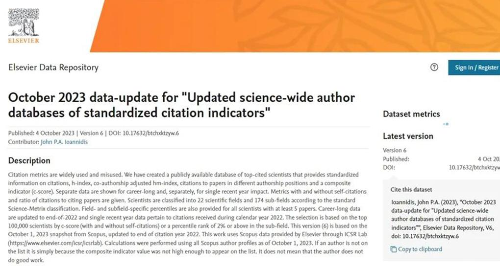 据悉,全球前2%顶尖科学家榜单是爱思唯尔数据库(Elsevier Data Repository)与斯坦福大学John P. A. Ioannidis教授团队合作的项目成果,发布在Elsevier旗下的Mendeley Data网站上。榜单基于Scopus数据库的引用数据系统分析,以被引数(区分自引和他引,提供自引数据)、H指数、HM因子等6种综合指标 (composite score,C-score),根据 “生涯影响力”和“年度影响力”从近700 万名科学家中遴选出世界排名前2%的科学家,分为22个领域和176个细分子领域;为科学家长期科研表现提供了一个衡量指标,能够更客观、更真实地反映科学家的影响力 。