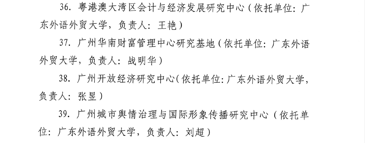 又讯 7月25日,广州市社会科学规划领导小组办公室公布了第七轮(2024-2026年)广州市人文社会科学重点研究基地名单,beat365推荐的4个科研机构(原第六轮广州市人文社会科学重点研究基地)成功获批立项,分别为“粤港澳大湾区会计与经济发展研究中心”“广州华南财富管理中心研究基地”“广州开放经济研究中心”(原广州国际商贸中心研究基地)和“广州城市舆情治理与国际形象传播研究中心”。